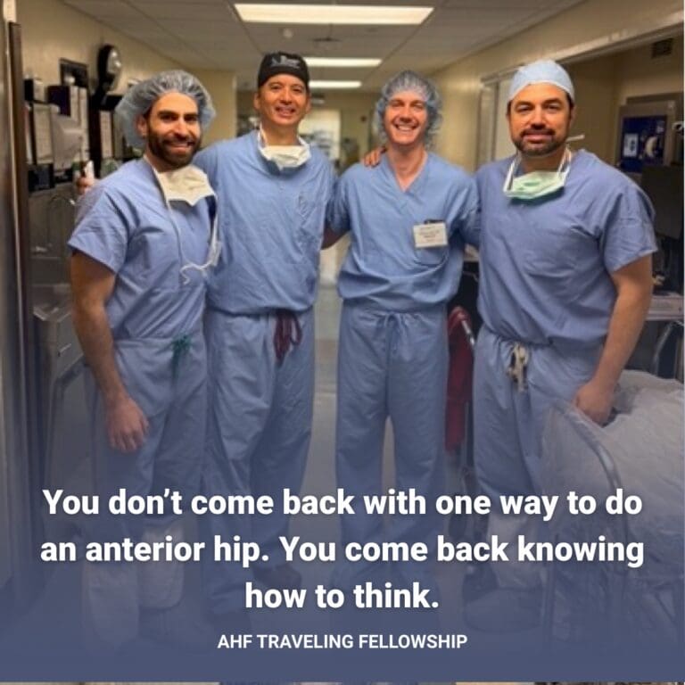 Every year, the AHF Traveling Fellowship brings together a small group of early-career orthopedic surgeons and places them into something rare – a high-trust, high-intensity clinical immersion designed to refine their anterior hip arthroplasty technique, expand their perspective, and connect them with mentors and peers who are just as serious about getting better for their patients.